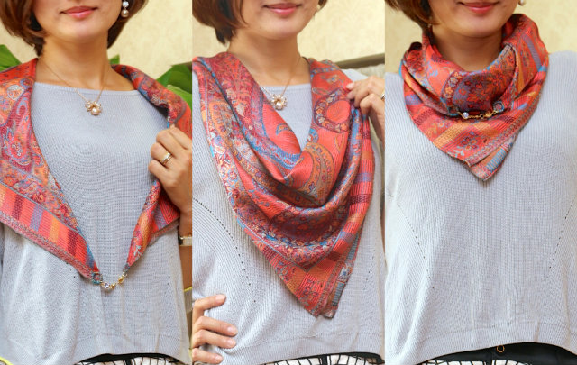 それが、上質なジャガード織の正方形スカーフ。対角線上の両角にスワロフスキーでデコレーションされたマグネットがついているので、今までスカーフをうまく使いこなせなかった方でも安心♡ 驚くほど手軽にアレンジが可能なんです。