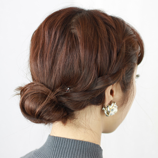 ①顔周りの髪の毛をとって二つに分け、下の毛を足しながらねじっていく