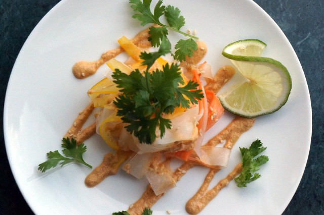3. 麺状にした、大根、人参、パプリカを、玄米黒酢、低温圧搾のごま油、塩であえておく。