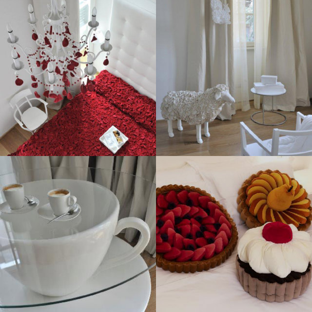 夢と現実が重なり絡み合う魔法の世界「アリスの部屋」や、すべて薔薇で飾られている「薔薇の部屋」、巨大なイブニングドレスがベッドとなりオートクチュールの豪華な世界で過ごす贅沢な夜を表現している「イブニングドレスでの眠り」など、ファンシーで可愛すぎるインテリアや調度品は必見です。