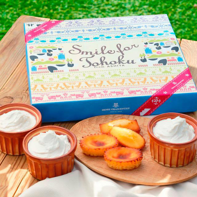 阪神淡路大震災を経験したアンリ・シャルパンティエは、2012年4月より「スマイルフォー東北—フロム芦屋」プロジェクトをスタート。“お菓子で笑顔を届けたい”をテーマに東北支援商品を販売。売上の一部を東日本大震災の復興支援団体に寄付、パティシエを目指す人のための奨学金制度の設立など、さまざまな取り組みをしてきたが、さらに2014年7月からは東北の特産品をお菓子にして全国に届ける新たな取り組みもスタートさせている。