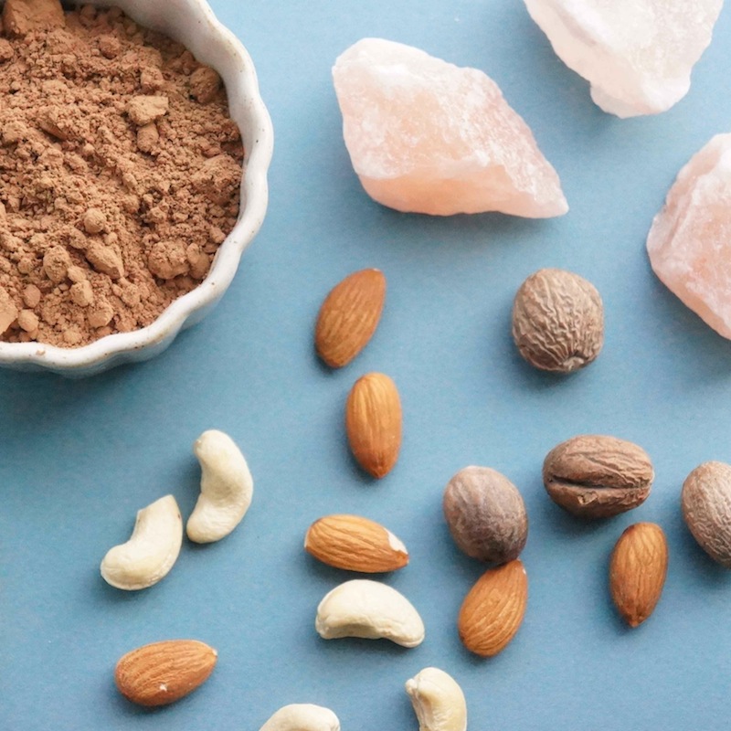 原材料:有機アーモンド、有機カシューナッツ、有機ココナッツオイル、有機カカオパウダー、有機ココナッツシュガー、有機アガベシロップ、有機イチジク、有機ナツメグパウダー、岩塩