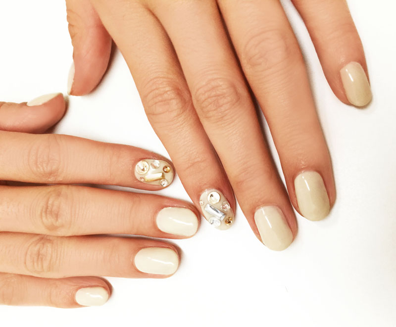 ポリッシュやジェルカラーに合わせ、色味を抑えたストーンを選ぶことで、オフィスにも派手すぎないほっこりした印象になります。