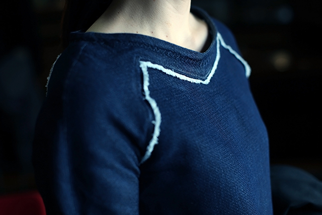 そんなデニムを履き込む、というと少し男性的なイメージが強いが、とても繊細に楽しめるアイテムも登場している。例えば今シーズンデビューを飾ったブランド“ko haction”では「精錬前のシルク(生糸)とデニムを折り合わせる」ことによって、着ていく程にシルクの艶感が増す、非常にエレガントなデザインを提案している。