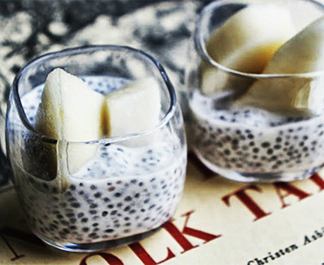 5. 小さめの深皿などに、チアシードプディングと、ざく切りにした洋梨と、お好みで分量外のローハニーをトッピングして、できあがり。