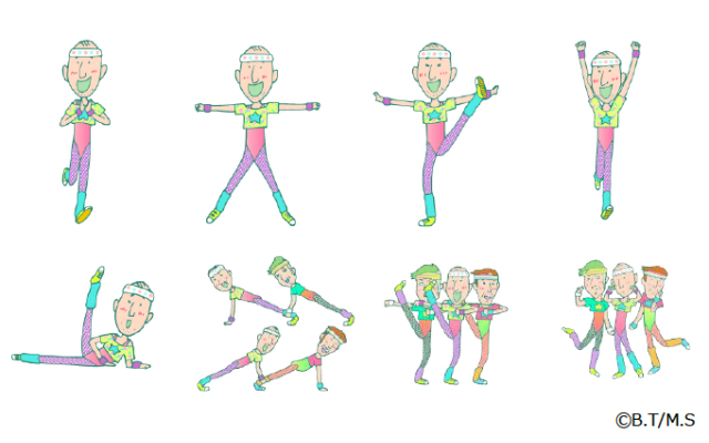 【ノリノリのミュージックと共に軽やかにエアロビクスを踊る「アミタイツのおじさん達」。スタンプを順に並べると動画と同じ一連の動きになる仕組みになっているのだとか】