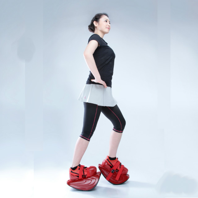 (1)まず運動靴を履いて、さらに『マスターストレッチ』専用のこちらの赤いシューズを装着