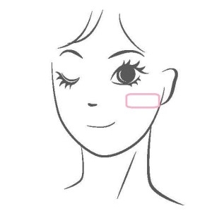 にっと笑った時にぷっくりと盛上がる頬の一番高い位置で黒目の下から、耳向かって楕円を描くようにチークを入れます。