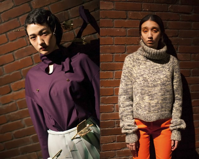 塩野さん『服に合わせて全体的にオレンジを使いたいけれど、フレッシュで健康的なオレンジというよりも、シリアスな雰囲気を残したいという要望がブランドからありました。ですので赤味の強いオレンジではなく、イエロー味の強いオレンジを、眉から目元全体、目の下にも影が出るように広い範囲にのせています。リップはほとんど色を使っていないので、アイラインとマスカラには同系色にすこしピンクが混ざった蛍光色を使って、モデルの目の動きで女性らしさが出るようにしました』