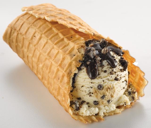 名前の通り、まるでメキシコ料理の「ブリトー」のような見た目の「アイスクリームブリトー」は、アイスクリーム(好みのフレーバー2種類)に砕いたチョコレートクッキーとチョコレートソースをトッピングして、お店手づくりの柔らかくもちっとした食感のワッフルで包んだ一品。