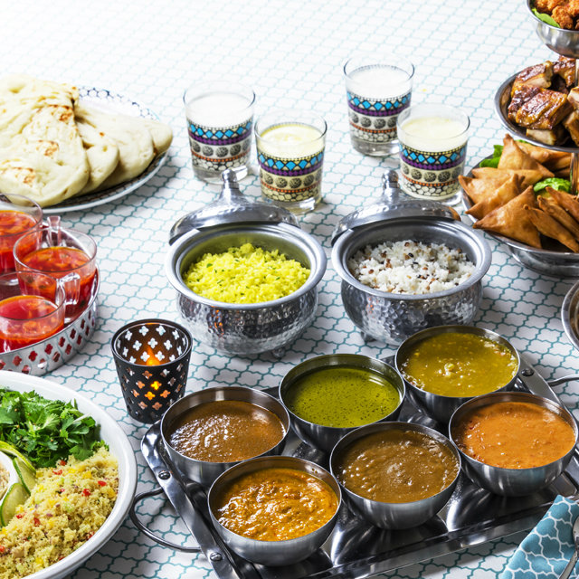 メニュー:クスクスのサラダ、サモサ、ケバブ風味のミートボール、ナン、マッサマンカレー、グリーンカレー、バターチキンなどカレー6種などなど