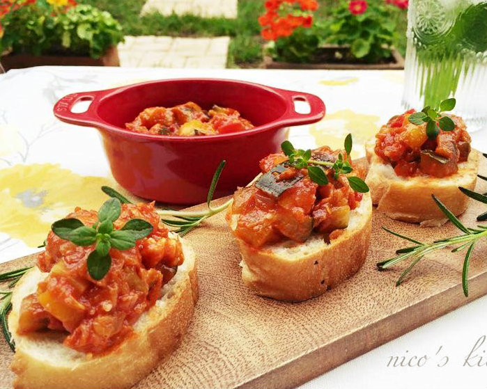 (2)コンソメキューブと夏野菜たっぷりラタトゥイユを加えて好きな濃度まで煮詰める。必要があれば塩胡椒で味を調えお好みのハーブを添えてできあがり。