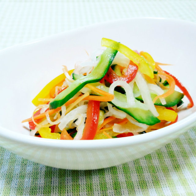 大根・・・5cm にんじん・・・1/3本 パプリカ(赤・黄)・・・各1/2個 きゅうり・・・1本 砂糖・・・小さじ2 白ワインビネガー・・・大さじ2 オリーブ油・・・大さじ1 塩・・・適量
