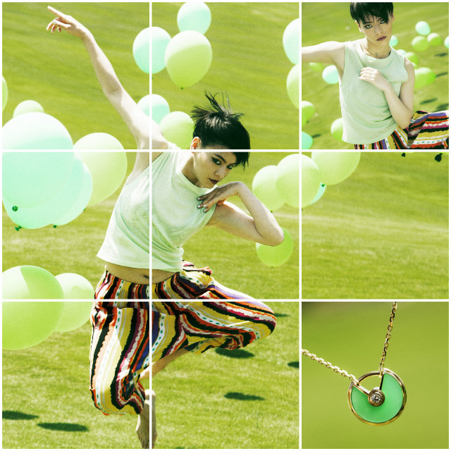 【菅原小春さんが「アミュレット ドゥ カルティエ」の中から選んだ石は「クリソプレーズ」。12枚の各写真には彼女に尋ねた全12個の質問の答えも合わせて紹介されています】