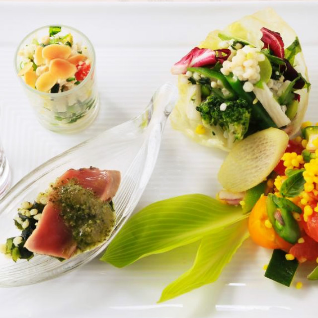 元々こちらの「シェフズ ライブ キッチン」では「ヘルシー・ビューティー・フレッシュ」をテーマにしていますが、佃料理長がソルガムきびの特色を活かすために様々なスパイスやフレーバー、食材を使い、サラダから料理、デザートに至るまで、16種類のメニューがラインナップされています。まさにメニューがこれまで以上に「ヘルシー・ビューティー・フレッシュ」になったという印象です。