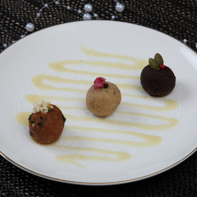 (3)かわいく演出するなら、コーティングやトッピングもおすすめ。パウダーやアーモンドダイスなどを入れたお椀に、みそまる1個を入れてコロコロ転がしながらコーティングしていきます。