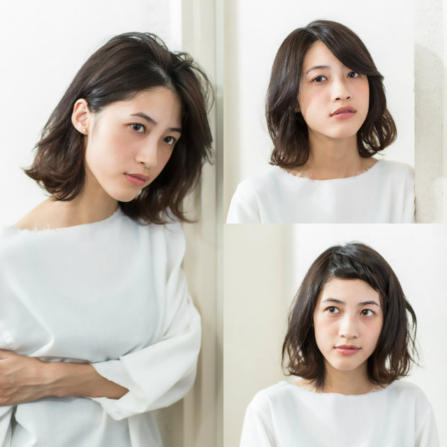 センターパーツで前髪をかき上げ風に流しつつ、トップにボリュームが出るように立ち上けます。サイドを耳にかけて、顔まわりをスッキリさせれば、よりクールな印象に。蒸し暑い季節にも軽快さを演出できますよ。