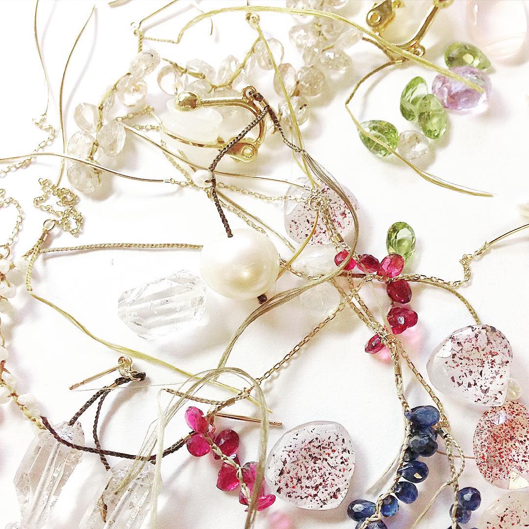 これらの一点物は「絹糸+天然石or水晶or淡水パール+10金イエローゴールド」の組み合わせ。惹かれた石、形と質を厳選されたパール、通常アイテムで使われいる金色の絹糸ではなく落ち着いた色味の絹糸と、早くも秋の訪れを感じさせるような可憐でいながら落ち着きのあるデザインが特長です。