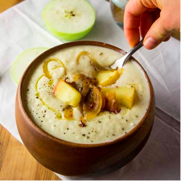 オーブンで焼いたカリフラワーとパースニップ、ココナッツミルク、野菜のだし汁をミキサーにかけてスープを作る。玉ねぎとリンゴをソテーしてカラメル状にしたものをトッピング。トリュフオイルをふりかけて。