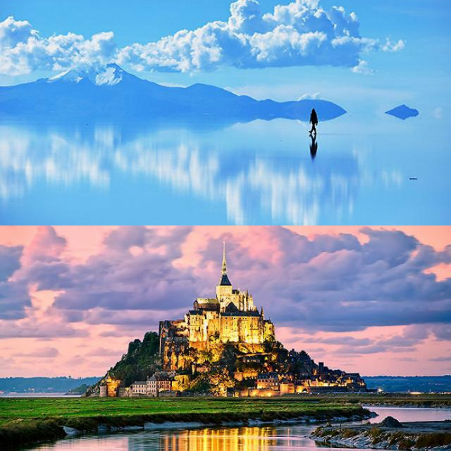 「ウユニ塩湖」で雨がよく降るのは年明けから2~3か月。湖に薄く水が張り、風が強くなく、晴れている、これらの条件を満たすと湖面に澄み切った「天空の鏡」が出現。空に浮かんでいた雲はいつのまにか湖面にとらえられ、空の青さもはっきりと映す湖では天と地の境界線を全く感じさせない不思議な光景に。