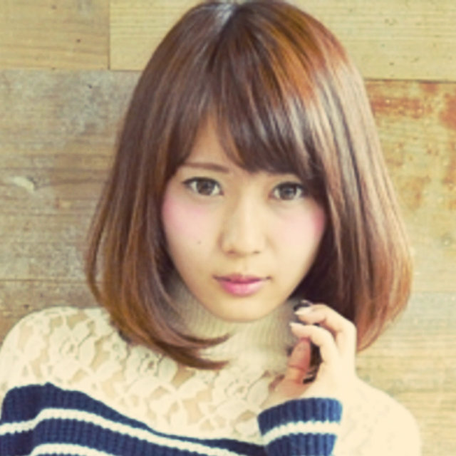 甘めの雰囲気を演出するなら“ぱっつん前髪”がオススメ! ワンカールのくせ付けした毛先とブラウン系の髪色が、よりラブリーな印象をつくってくれます。