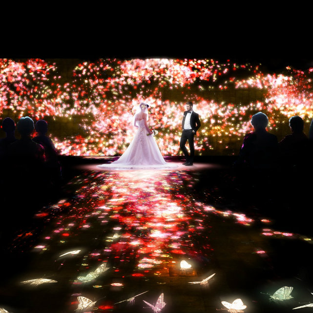 この人前式は国内外で高い評価を受けているデジタルアート集団「チームラボ」とのブライダル業界初の挙式コラボレーションとのことで、構想から約1年を経て完成したプランなのだそうです。