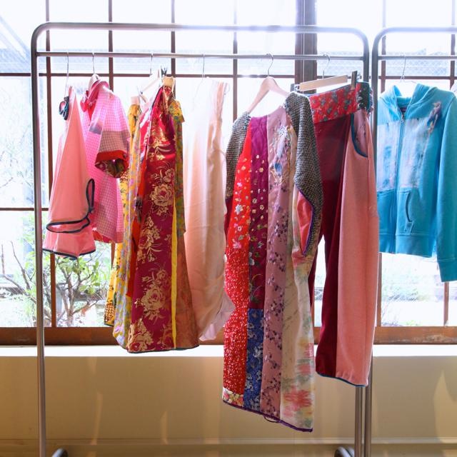 店内2Fに展開されている4月の新作コレクション『睡園国よりの使者』は、ウィンドウインスタレーションとも少しリンクした白や柔らかい色・柄が使われ、春らしさが満載。チャイナ服の生地や花柄など様々な布をパッチワークして組み立てられています。