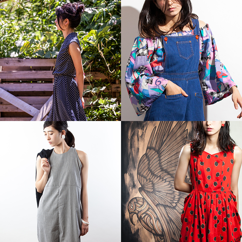 【古着リメイクのトップス ¥2,800、古着のサロペット ¥6,200】