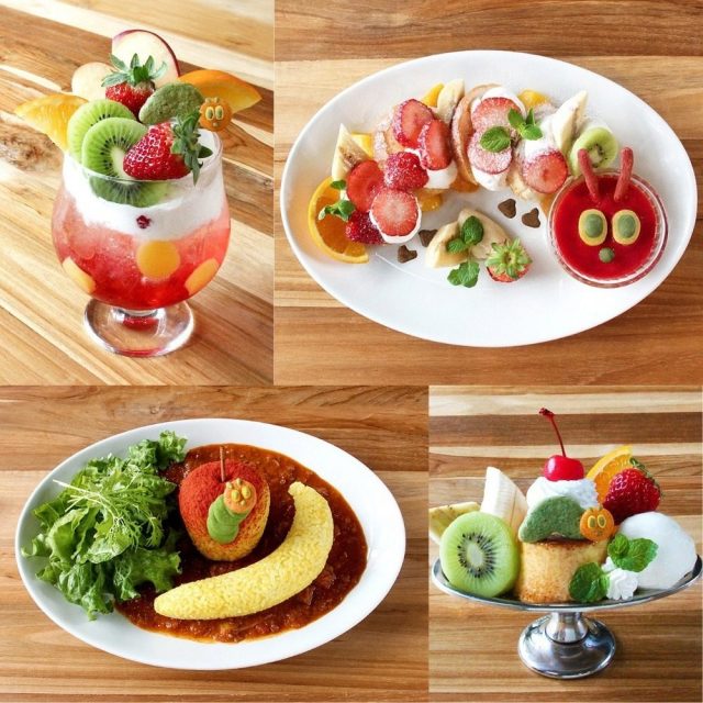 カフェのコンセプトは“フルーツパーラー”とのことで、はらぺこあおむしの大好きなフルーツをたっぷりあしらったフルーツサンドやプリン・ア・ラ・モードなど、フルーツたっぷりの可愛らしくて体に優しいメニューが勢ぞろい。