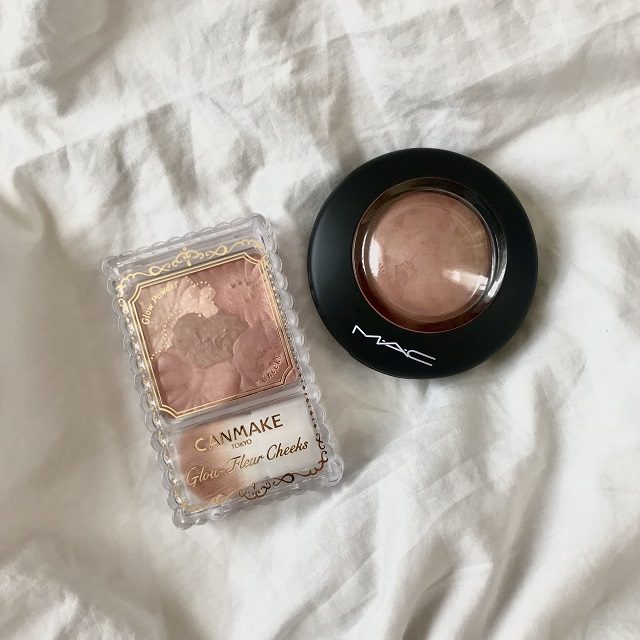 今回比較する2つはどちらもオレンジベースで、ブロンザーとしても使えそうな“ツヤ系ベージュチーク”。粉質はキャンメイクの方が柔らかく、実際に肌にのせて発色を比較してみるとキャンメイクの方がやや赤みが強く、M•A•Cの方がより肌色に近いニュートラルな印象です。