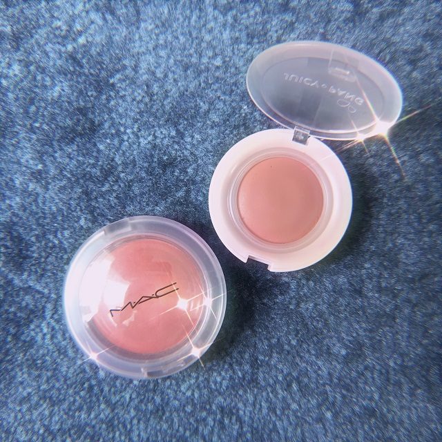 2つのチークは、いずれもパウダーでもクリームでもなく、パウダーとクリームそれぞれつ長所が合わさったような弾力のあるもちもち感が特徴。M•A•Cの方が軽く押しただけで指跡が残るくらい柔らかく、クリーム感が強めです。そして、気になる色味ですが、M•A•Cの方はよりピンク感が強く、A’PIEUの方はオレンジがベースのコーラルカラーとなっています。