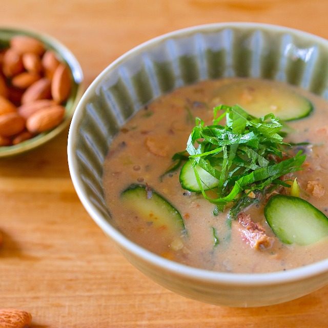 【アーモンドミルク冷や汁】の味の決め手となるのが、文字通り「アーモンドミルク」。“ナッツの王様”とも呼ばれるアーモンドを粉砕して液体にしたアーモンドミルクは抗酸化作用の高いビタミンEをはじめ、オレイン酸、食物繊維、ミネラルなどの栄養素を効率よく摂ることができるので、疲れの出やすい暑い季節の栄養サポートにピッタリと言えます。ぜひトライしてみてくださいね。<レシピ提供:料理研究家・河瀬璃菜さん>