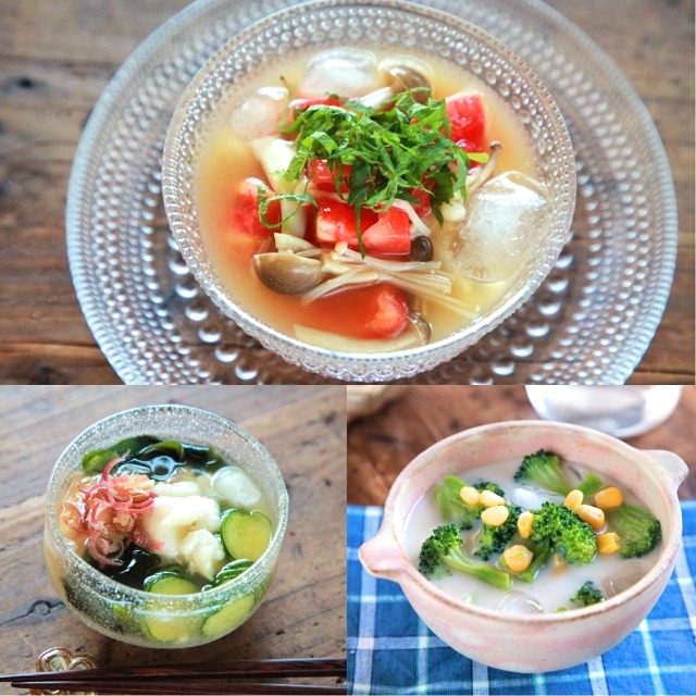 料理研究家・Mizukiさんによると「体をクールダウンするためにも水分やカリウムが豊富な食材を使用することがポイント」とのこと。また、管理栄養士・北嶋佳奈さんによれば、「みそ汁は熱中症予防に重要な塩分と水分を同時に摂取できると同時に、汗と一緒に流れ出るミネラルや代謝によって失われるビタミンの補給も叶います。また、腸内環境を整える作用や抗酸化作用によって免疫低下を防いでくれる」そうです。気づかぬ内に食欲不振や脱水症状など体調を崩しやすいこの季節、ぜひ“冷やしみそ汁”を食卓に採り入れてみてくださいね。<レシピ提供:株式会社ミソド>
