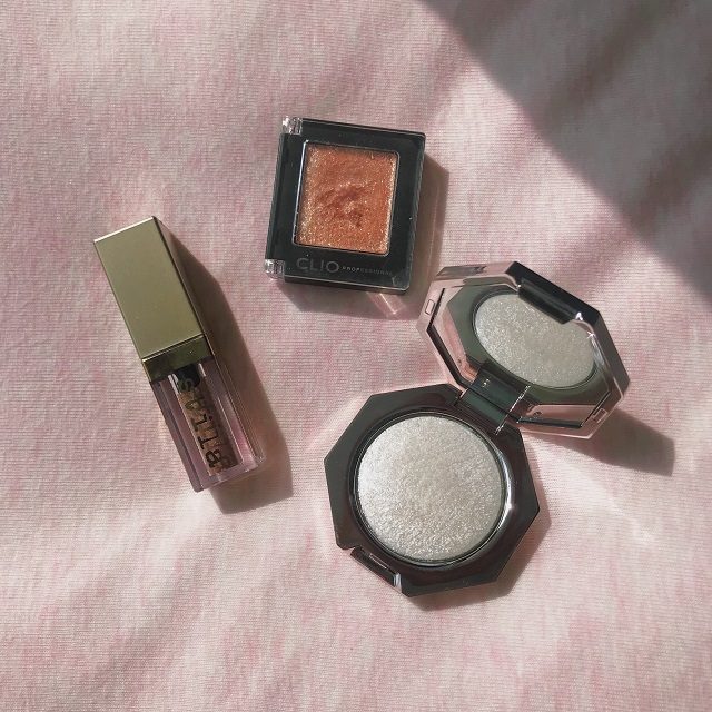 華やかさと煌めきある“潤みまぶた”をつくるアイシャドウとして外せない3アイテムがCLIO(クリオ)「プロシングルシャドウ G10」、FENTY BEAUTY(フェンティ ビューティー)「DIAMOND BOMB HOW MANY CARATS?!」のプレストアイシャドウ2種と、stila(スティラ)の「リキッドアイシャドウ eternal」になります。