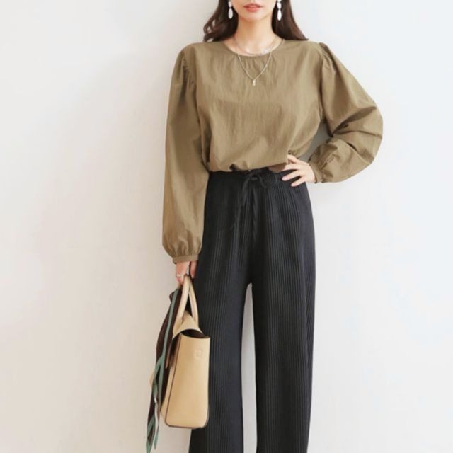 カジュアルダウンしたスタイルにはグロッシーな素材のプリーツパンツを。きれいめな雰囲気をかもせるので、洗練度の高い大人カジュアルを楽しめます。