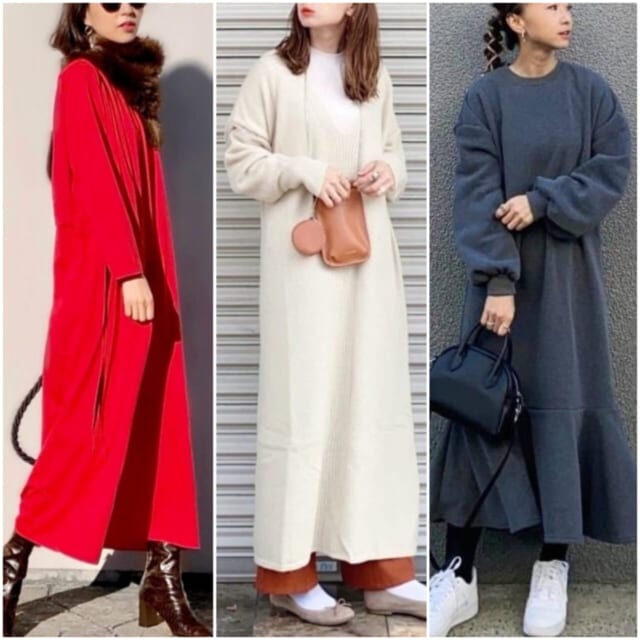 旬な冬のワンピーススタイルを作るポイント(1)スウェットワンピは“オンナらしいシルエット”をチョイス