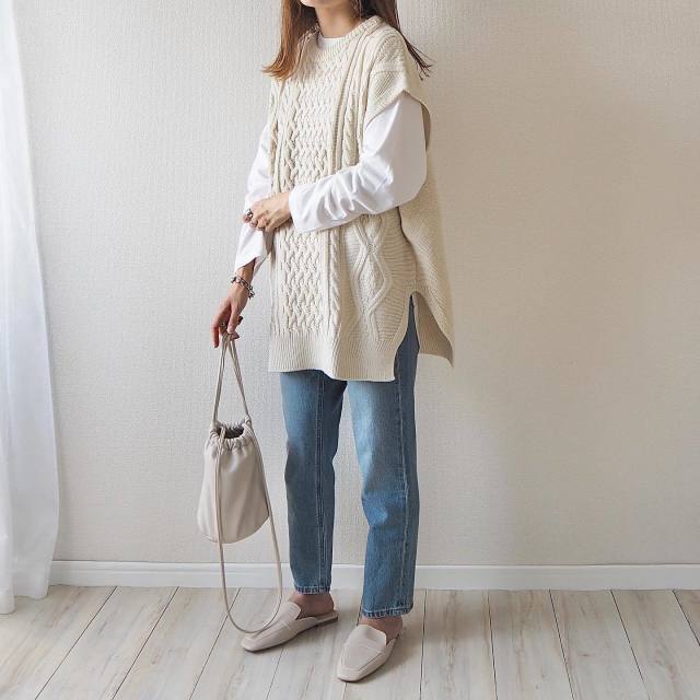 カジュアルなスタイルに存在感のあるケーブル編みニットベストをオンするだけで、アクセントの効いたオンナらしく落ち着いた印象に。合わせるインナーをシャツなどに変えるだけでも、異なる雰囲気に仕上がるので幅広い着こなしを愉しみましょう。