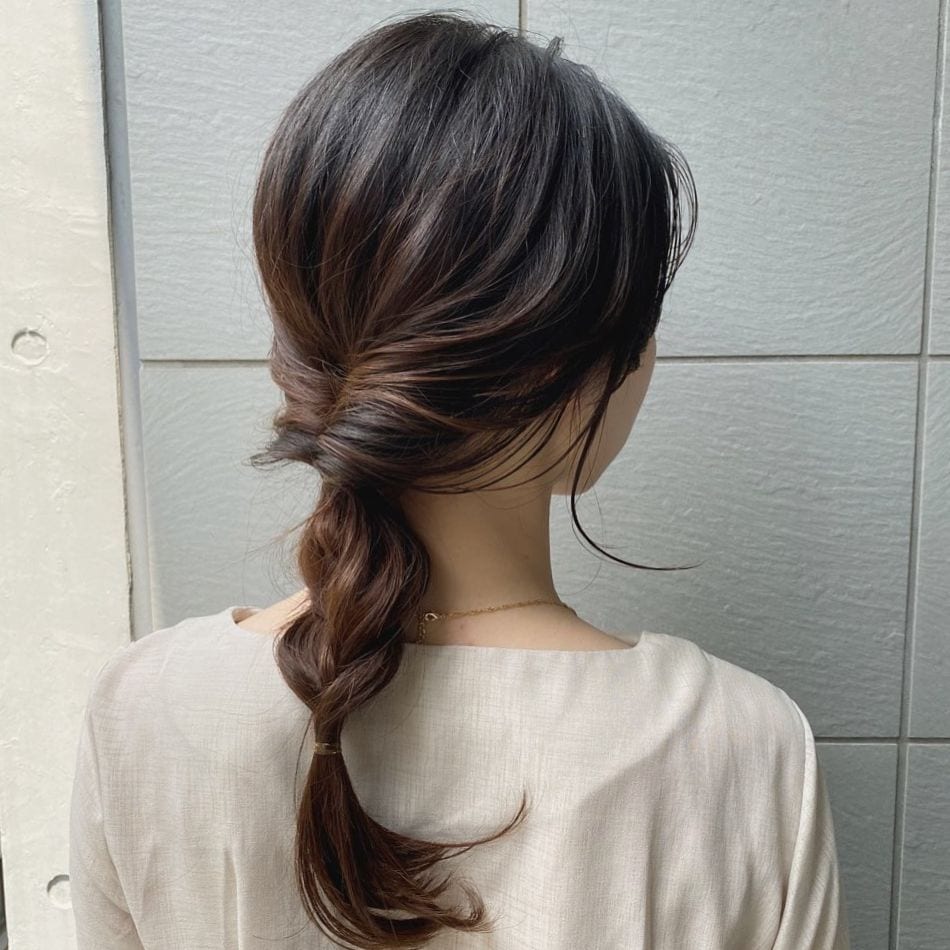 オンナっぽい雰囲気を前面に出すなら、三つ編みを組み合わせるだけでできる“編み込み風ローポニー”がおすすめ。三つ編みによるボリューム感が華やかな雰囲気を引き立てます。