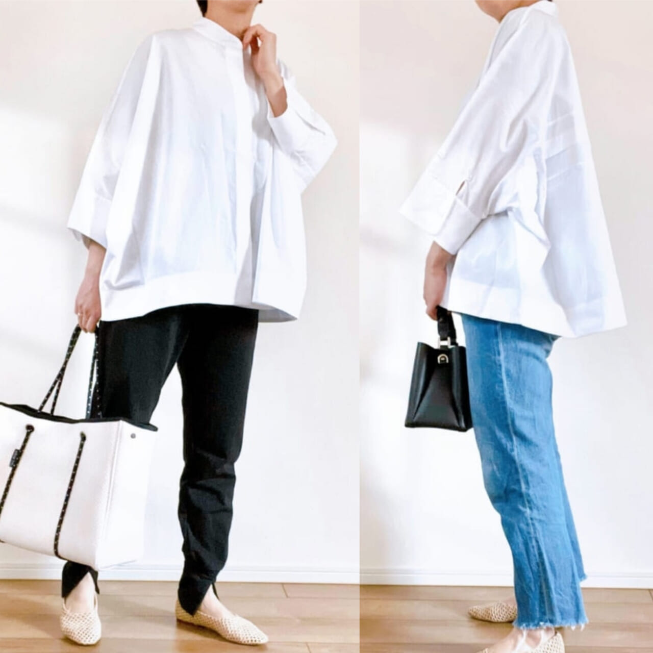 今シーズンも話題のユニクロとファッションデザイナーのジル・サンダー氏によるコレクション「+J」は即日完売したアイテムも多々。その中でも名品とも言える逸品が「スーピマコットンドルマンスリーブシャツ(7分丈)」です。それではおしゃれな着回しのコツを紹介します(私は身長152cmでSサイズを着用しています)。
