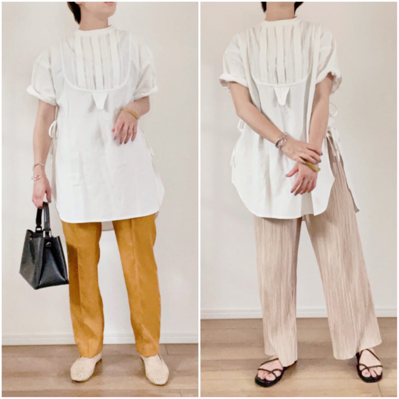 トレンドのバンドカラーにクラシカルな胸元のタックデザインが高見えする1枚で、ハリのあるインド綿とヴィンテージのような風合いがおしゃれ感たっぷり。また、お尻まで隠れる安心な丈感と程良いオーバーシルエットで体型カバー力が高い反面、サイドにリボン付きの深めスリットが施されているのでどんなボトムスでもスッキリと合わせられるのも嬉しいポイントです。さらに、ロールアップされた袖口、ボタン仕様のバックスタイルと、どこから見てもスキのないデザイン性の高さも魅力と言えるでしょう。