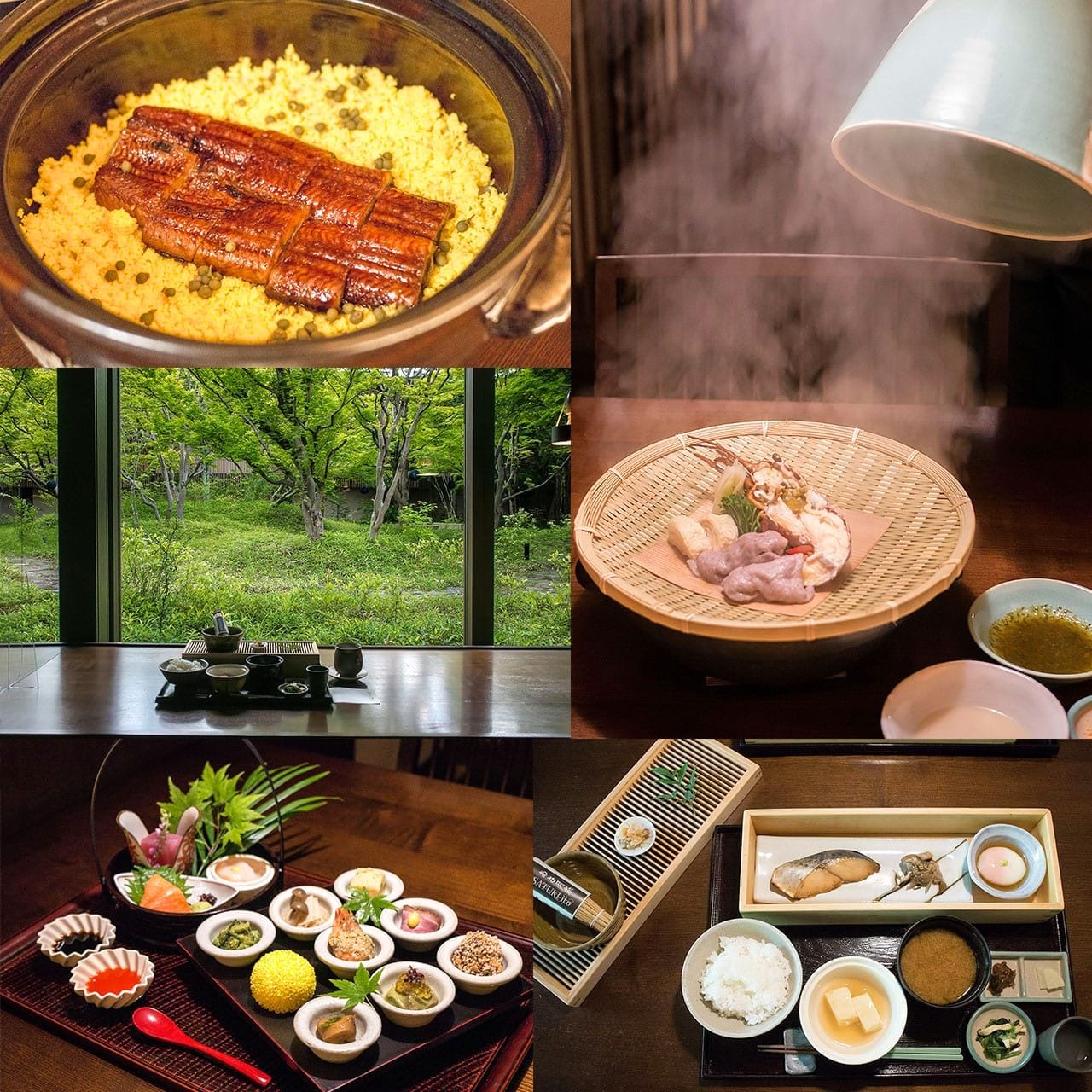 鬼怒川に棲む龍伝説にちなんで、伊勢海老や牛ロース、湯葉などを、ゲストの目の前で一気に蒸し上げる「龍神蒸し」。蒸すために料理に被せる青磁の益子焼も専用の特注品となります。