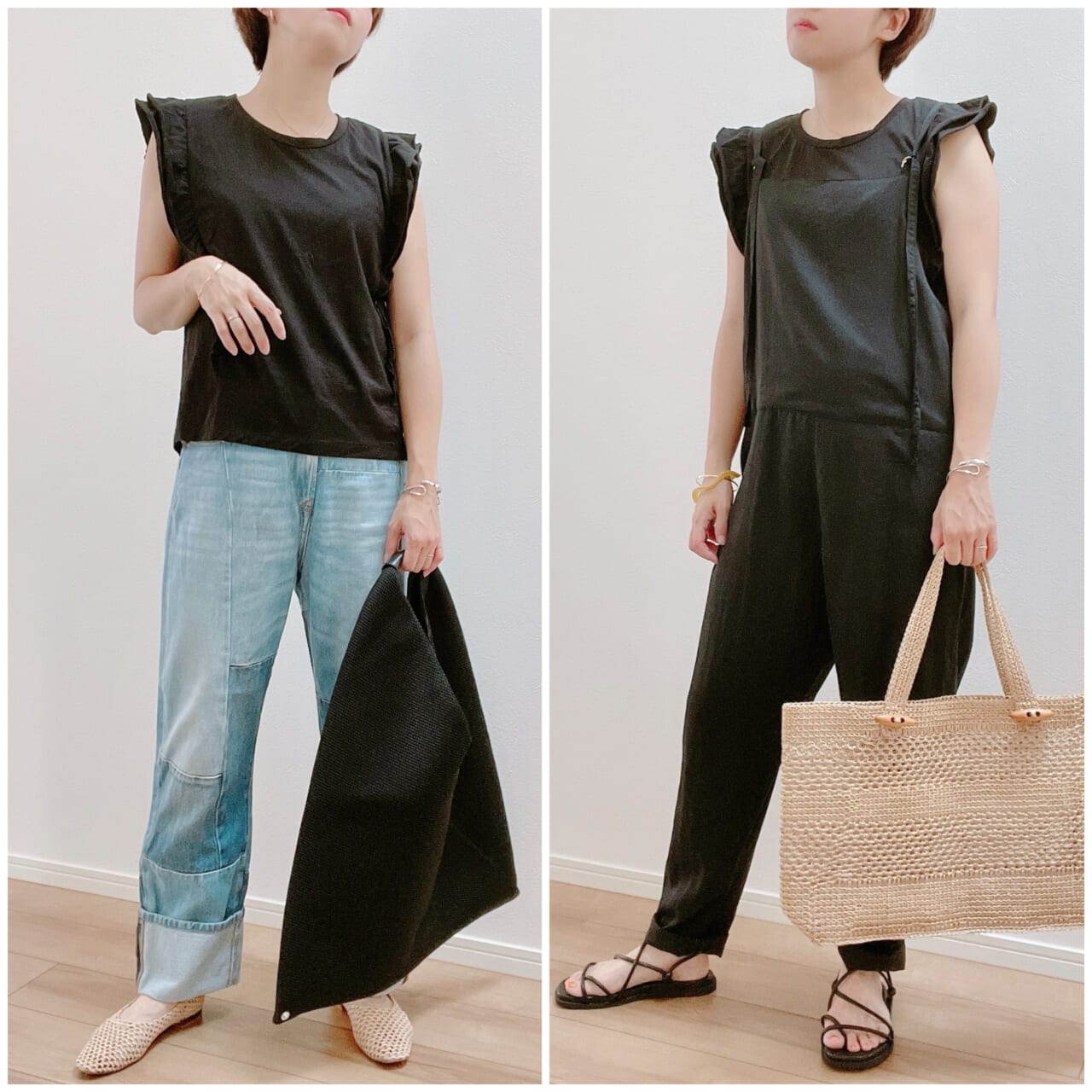 絶妙なボリューム感が可愛いフリルTは、ブラックなら甘さをほんのりと抑えてくれるので大人でも採り入れやすいはず。また、フリルで上手く肩周りをカバーできるのも嬉しいポイントです。絶妙な丈感がインもアウトもしやすいので、どんなボトムとも合わせやすいので、早速トレンドライクな着回しテクをチェックしてみましょう。