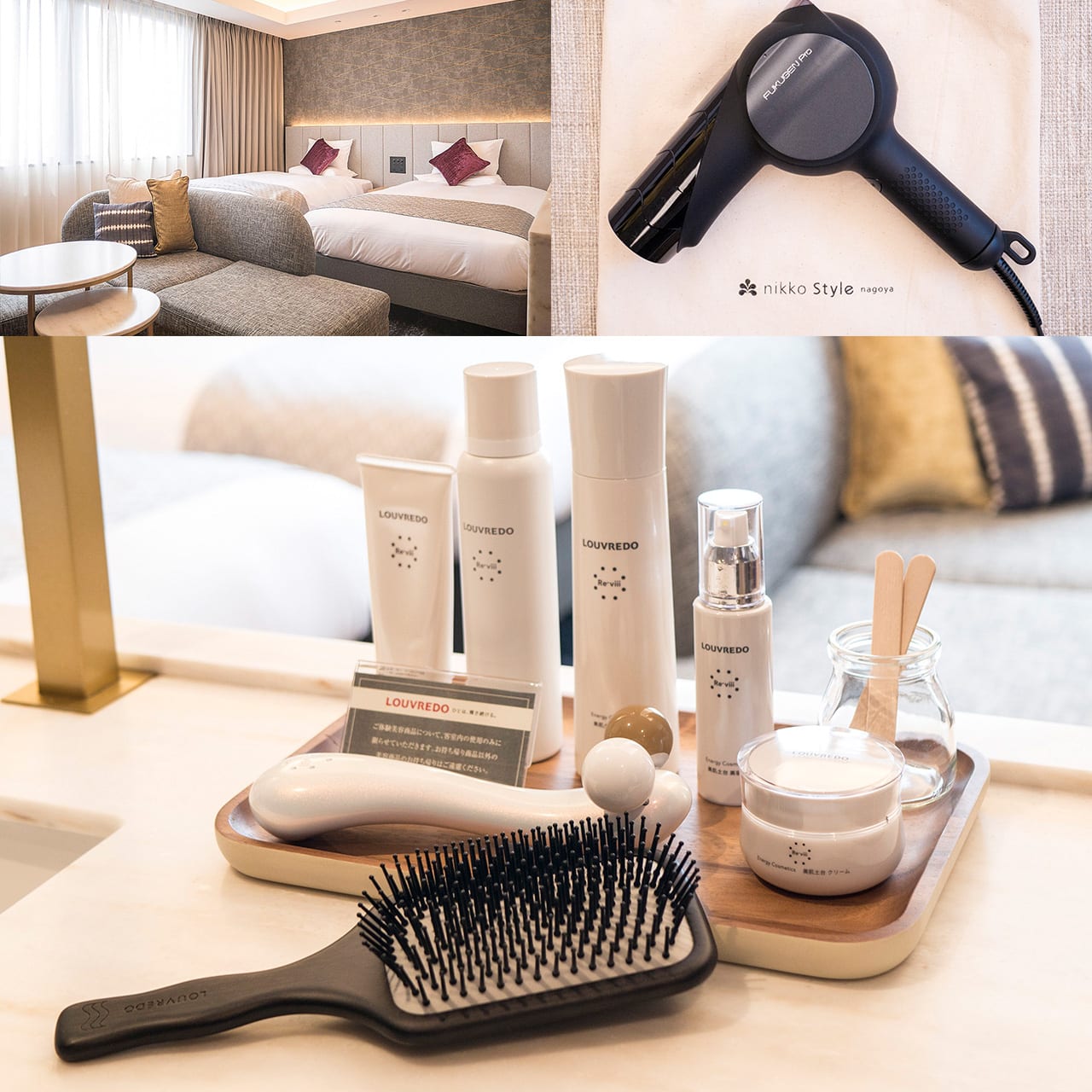 「髪に天使の輪ができる!」と好評を呼ぶLOUVREDO(ルーヴルドー)の復元ドライヤー®を全客室に完備するライフスタイルホテル「ニッコースタイル名古屋」では、いま1日1室限定でヘアケアとスキンケアの商品14点を試せる【ルーヴルドー ルーム】が用意されています。感動の美容体験と非日常のホテルステイをダブルで堪能してみましょう。