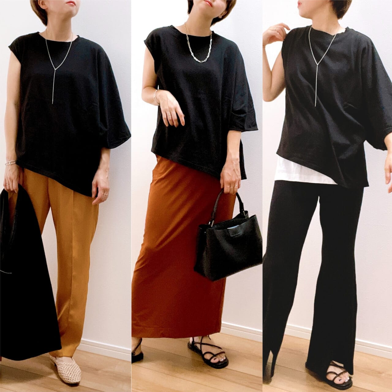 片袖はフレンチスリーブで、もう片袖は5分丈のドルマンスリーブになっている【ワザありデザインT】は1枚でサマ見えするだけでなく、程良くゆるっとしたシルエットで体型カバー効果を発揮してくれます。また、アシンメトリーになった裾がバランスの良い丈感を実現してくれているので、アウトしても着こなしやすいのも魅力。それでは、晩夏にピッタリな着回しコーデをチェックしてみましょう。