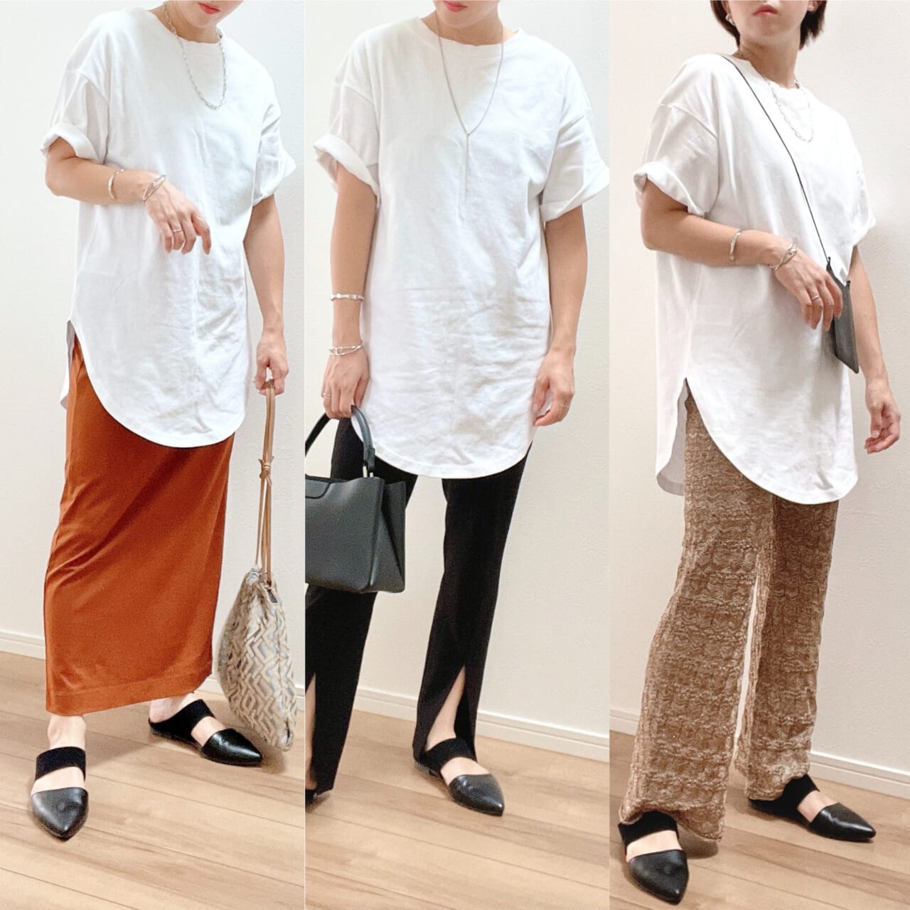 ハリ感のある厚みのある生地と半端袖なので、季節の変わり目の今にピッタリ。また、程良くゆとりのあるストレートシルエットとドロップショルダーでキレイさもキープできます。また、少し長めの絶妙な着丈とラウンドヘムでスッキリとした印象で着られるのも優秀ポイント。寒くなってきたら上にニットやスウェットをオンして裾をチラ見せするレイヤードスタイルと好相性です。それでは着回しコーデをチェックしてみましょう。