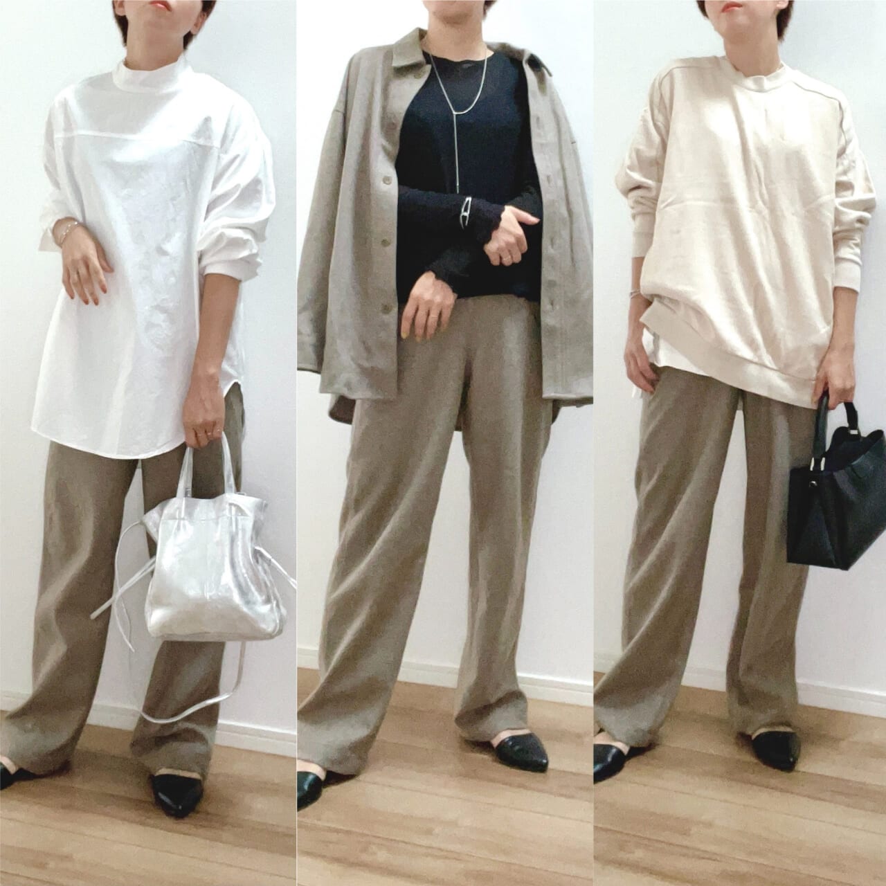 パンツは、ハイウエストかつ太すぎない絶妙なストレートシルエットがとにかくキレイ見えする1本。フロントはきちんと感のあるデザインですが、後ろがゴム仕様になっているのでは着心地もラクちんなのは、さすがユニクロです。それでは、きれいめからカジュアルまで何にでも合わせやすいストレートパンツの着回しを紹介します。