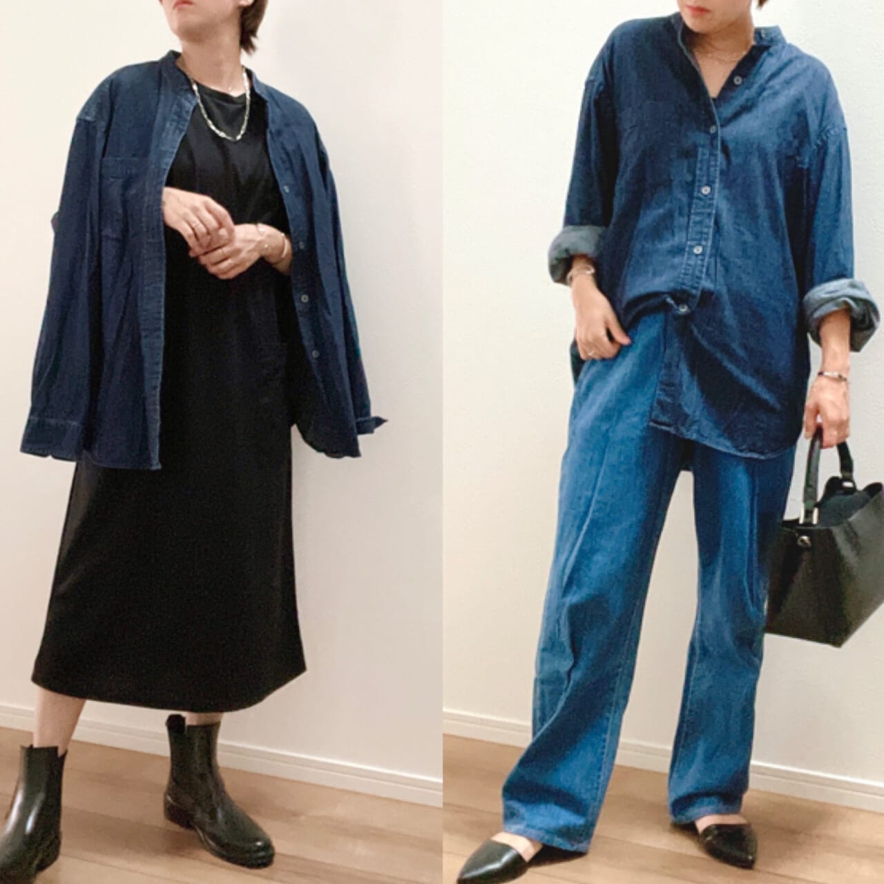 濃すぎず落ち着き感のあるネイビーカラーが、大人感を損なわずにカジュアルから甘めまで、幅広いスタイルと相性抜群。また、程良い厚みでごわつかない生地は着心地もよく、スタンドカラーで首周りがスッキリと見せられます。また、メンズのオーバーサイズなので体型カバーも叶うのも嬉しいポイント。それでは、着回しコーデを紹介します(※身長152cmでMサイズを着用)。