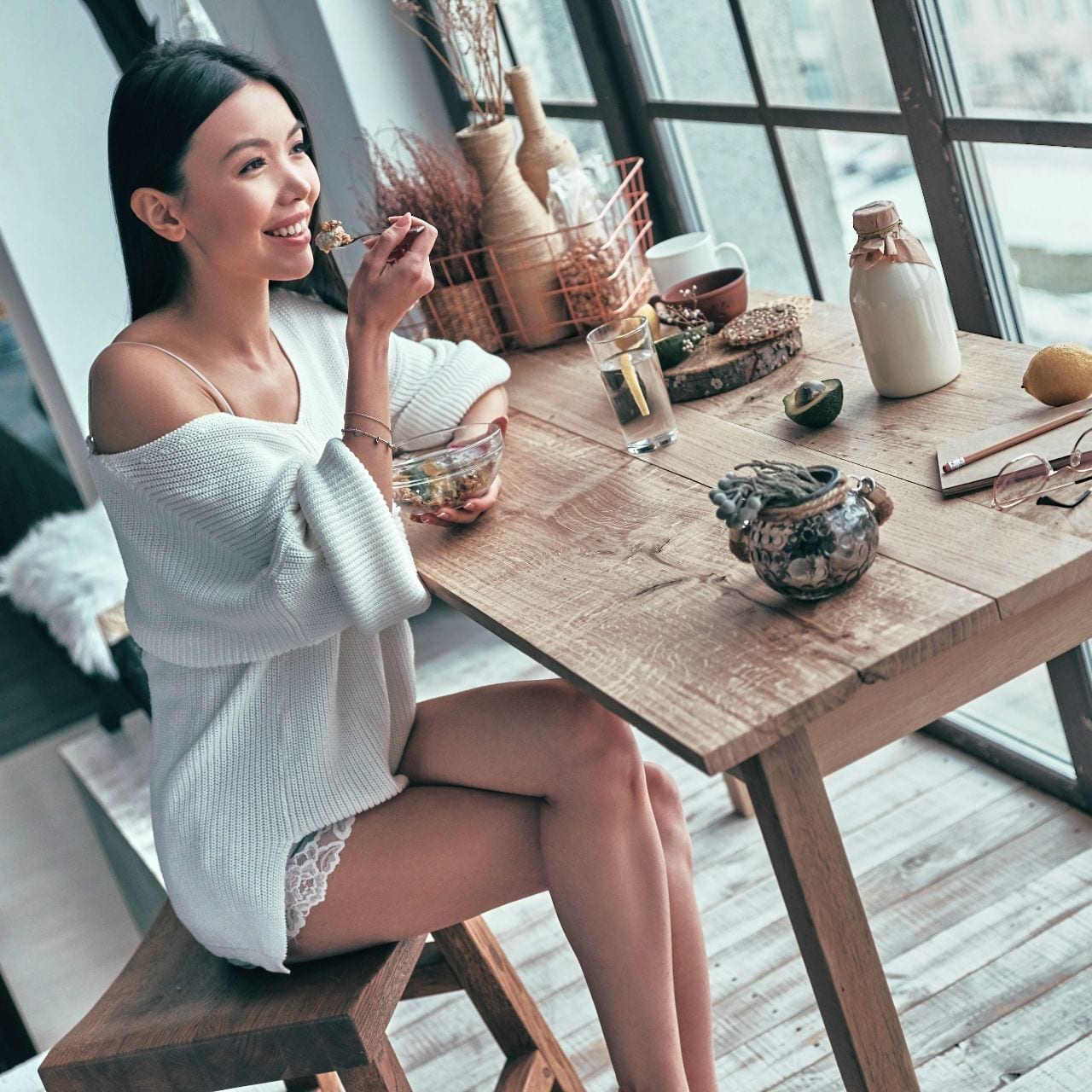 実は、朝にきちんと炭水化物、脂肪、プロテインといった栄養素をしっかりと摂っておくと、「基礎代謝が上がって、脂肪燃焼が促進される」とコートニー。ヘルシーなメニューで朝からしっかり栄養を摂ることで、体型キープの礎にしていきましょうね。