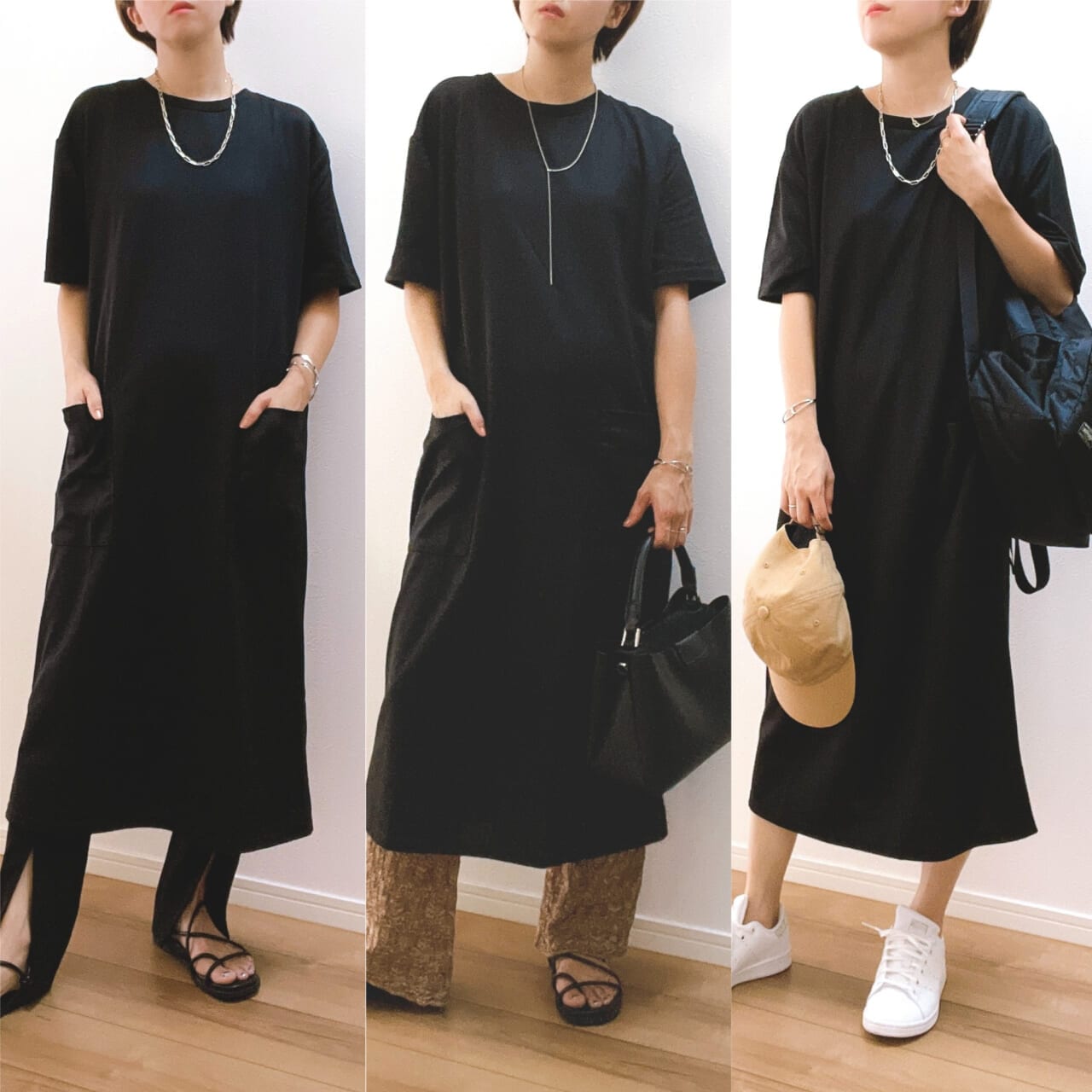 そこで今回ピックアップするのがZARA(ザラ)の「ポケット付きミディ丈ワンピース」。フロントに付いたポケットがさり気なくアクセントになっており、シンプルになりすぎずに着られて、利便性も抜群。身体のラインを拾いにくい程よくゆとりのあるストンとしたストレートシルエットと、しっかりとした生地感がカジュアルになりにくく、体型カバーも叶います。また、低身長さんでもボトムスがレイヤードしやすいミディ丈なのも魅力。それでは着回しのコツをチェックしてみましょう。