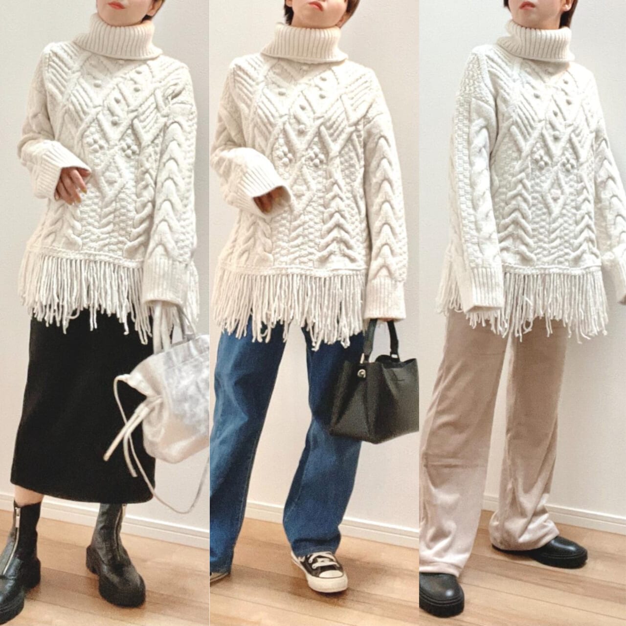 特にマストで抑えたいのが、フリンジヘムデザインと立体感のある複数の編地が遊びを効かせてくれる「フリンジ付きニットセーター」。白ニットというとほっこりと可愛らしい印象がありますが、裾のフリンジが抜け感たっぷりで新鮮。また、ゆるっとしたオーバーシルエットで今シーズンらしさの叶う1枚です。それでは着回しリアルコーデを紹介します。